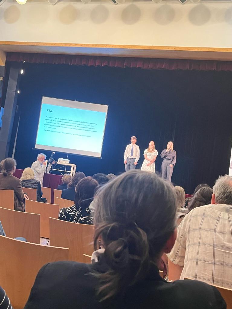 Naši žáci, Pavla Kejzlarová, Tereza Myšáková a Tomáš Zůna pod vedením paní učitelky Blanky Rochlové představili ve své prezentaci pana Jaroslava Hložka, zakladatele slánského Dividýlka,ale i dřívějšího místostarostu našeho města.Projekt organizuje nezisková organizace Post Bellum.Všichni tři žáci velmi působivě odprezentovali nashromážděné informace o panu Hložkovi a za svůj přirozený a bezprostřední projev si vysloužili velký potlesk i slova uznání od prezentovaného pamětníka. My jim všem děkujeme a věříme, že práce nad tímto projektem byla pro ně velkou novou zkušeností.